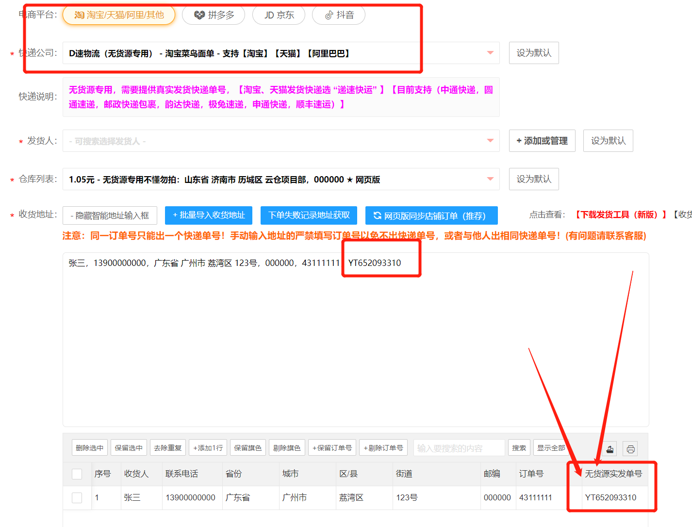 示例:张三,13900000000,广东省 广州市 荔湾区 123号,000000,43111111,YT652093310(YT652093310就是上家的物流单号)